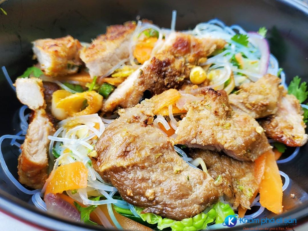 Bún thịt nướng có lẻ đã khá quen thuộc và nhiều bạn sẽ không hào hứng lắm để thử qua nó. Thế nhưng, đây chính lại là một món ngon ở Huế, và dù “vô cùng quen mặt”, nhưng thịt nướng được dùng trong món ăn này thường là xâu thịt nướng được chế biến từ thịt ba chỉ mỏng được ướp cùng với các loại gia vị như: tiêu, hành, nướm mắm, ngũ vị hương, vừng (mè); dậy mùi và vị rất đặc sắc, vô cùng bắt miệng “ăn là chỉ có ghiền” ngay.